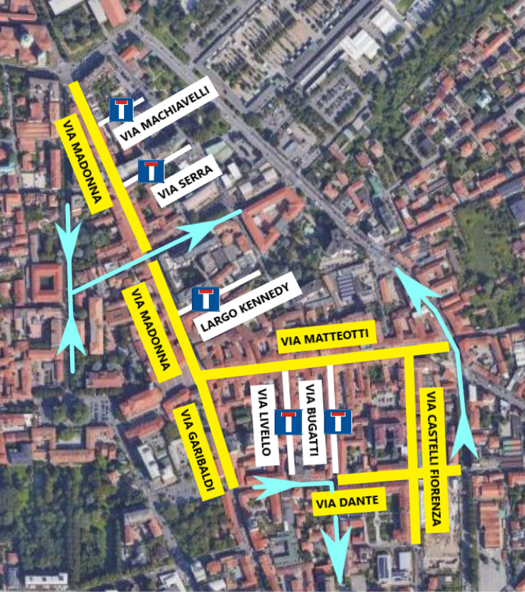 L.go KENNEDY, come STRADA A FONDO CIECO con accesso consentito, in entrata ed uscita, ai veicoli da Via Pomè; Via SERRA, nel tratto compreso tra Via Goglio e Via Madonna, come STRADA A FONDO CIECO con accesso consentito, in entrata da Via Serra ed uscita da Via Martiri di Belfiore;